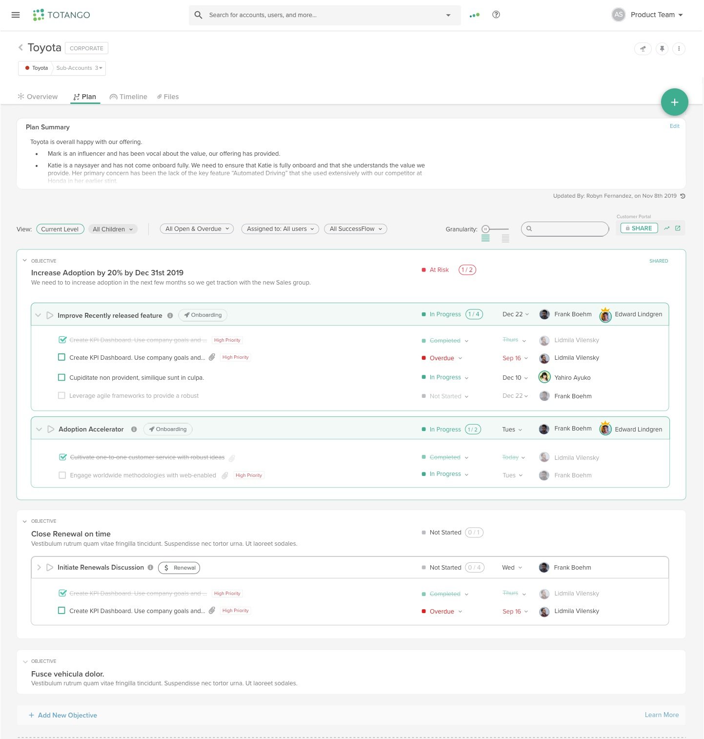 The solution we designed enabled the success managers to manage the plans with their customers within Totango and share it with customer as well.